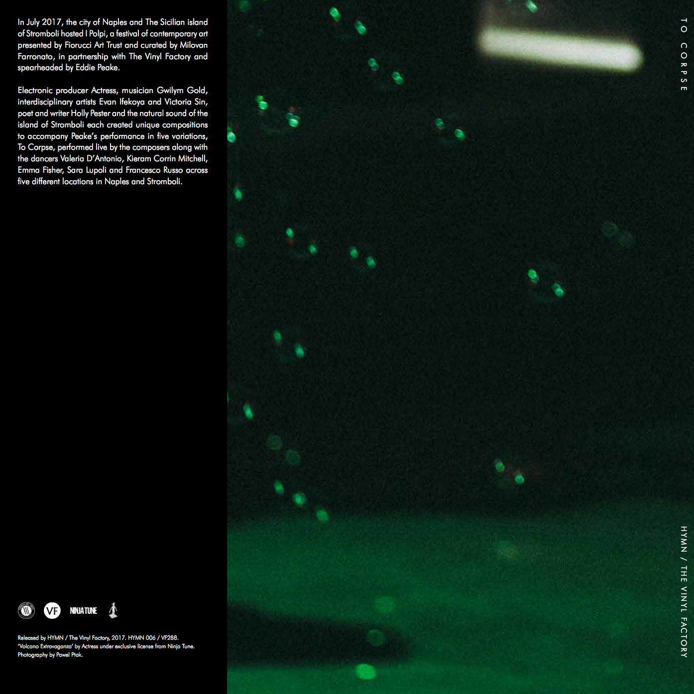 Electronic producer Actress, musician Gwilym Gold, interdisciplinary artists Evan Ifekoya and Victoria Sin, poet and writer Holly Pester and the natural sound of the island of Stromboli each created unique compositions to accompany Peake’s performance in five variations, To Corpse, performed live by the composers along with the dancers Valeria D’Antonio, Kieram Corrin Mitchell, Emma Fisher, Sara Lupoli and Francesco Russo across five different locations in Naples and Stromboli.