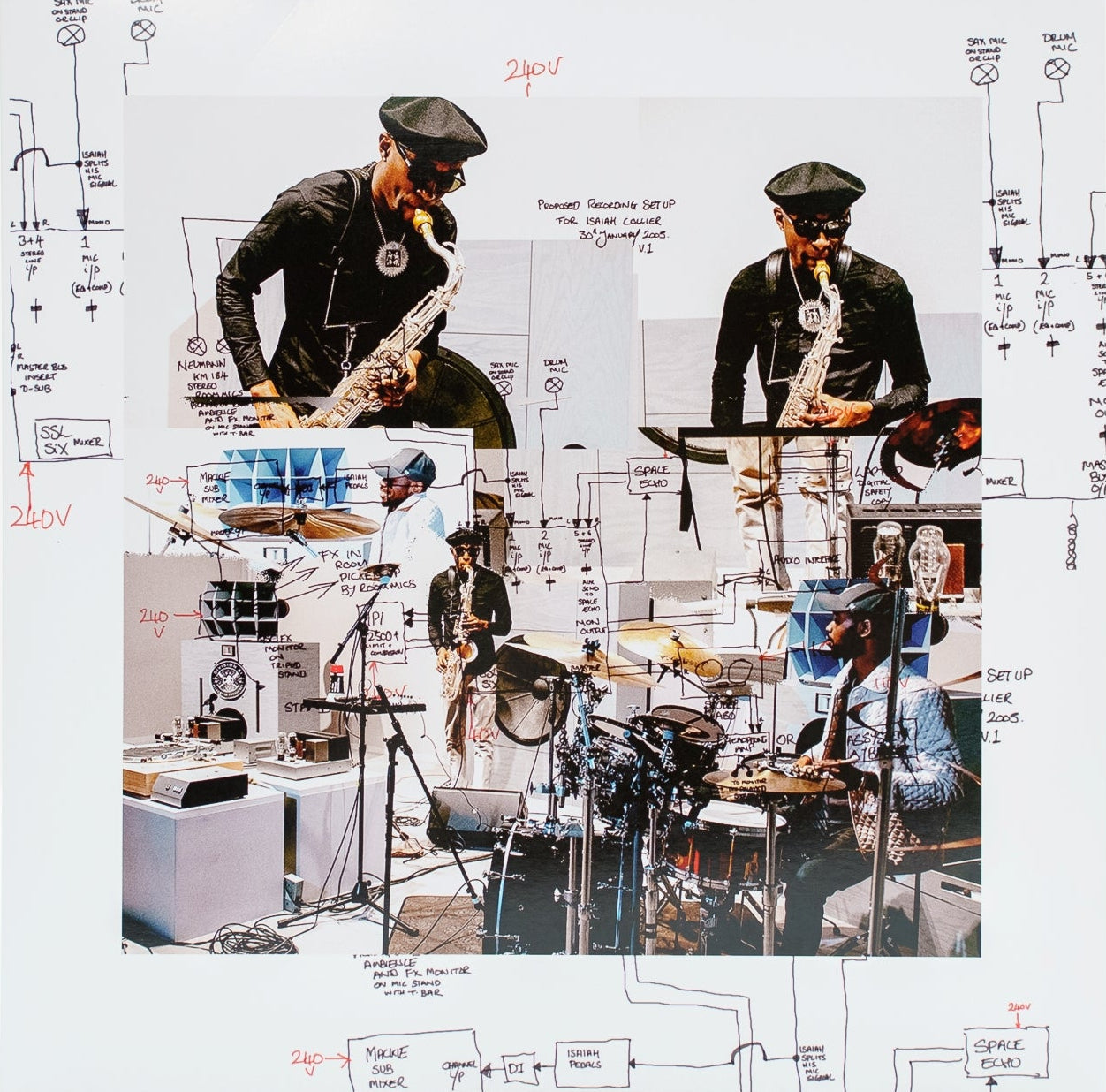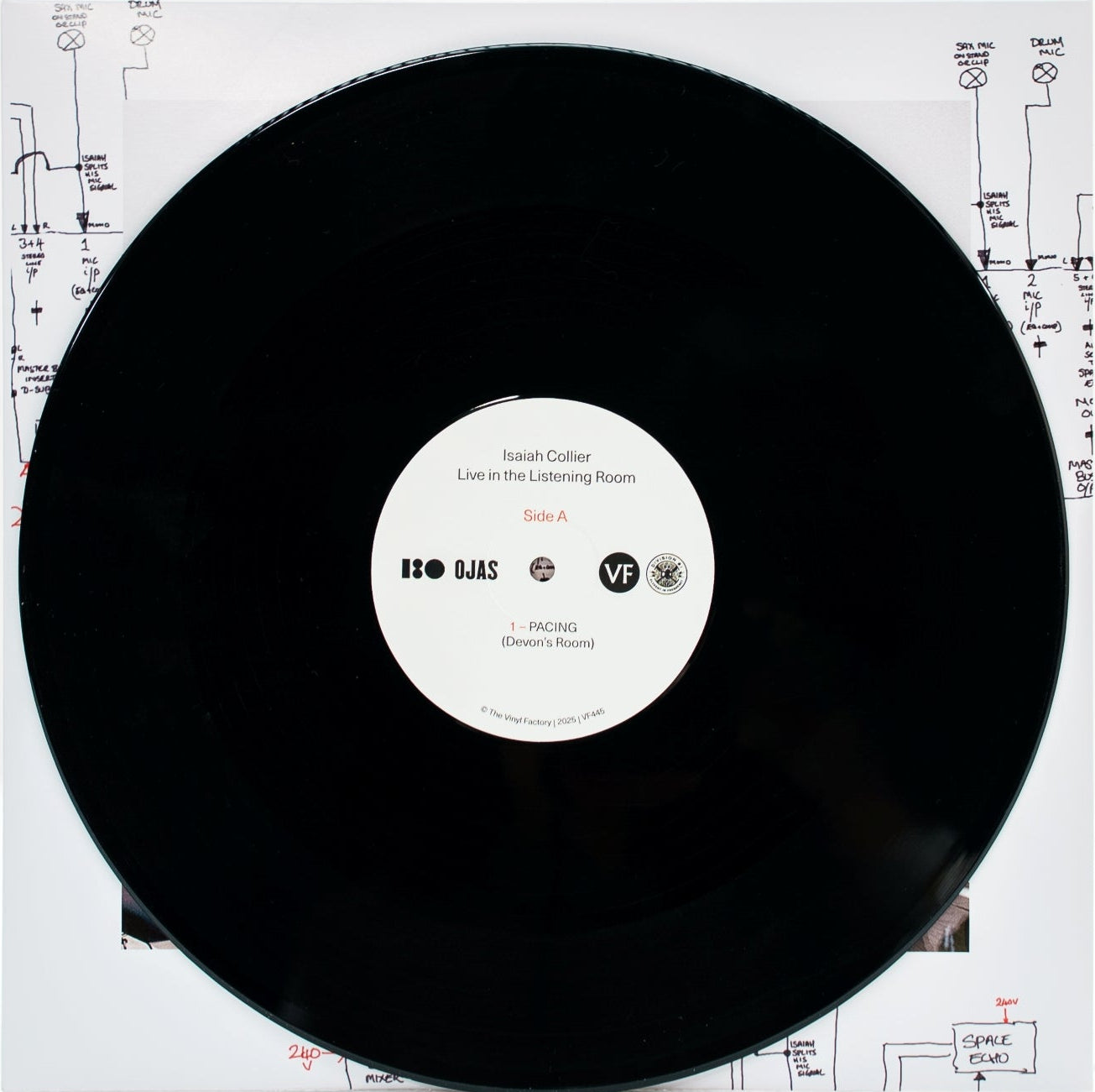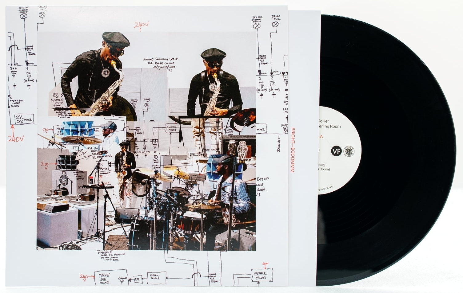The session was engineered by Jamie Harley recording direct-to-tape. Producer Sonny Daze added in live space echo reminiscence to classic records by Lee “Scratch” Perry and Curtis Mayfield. “I wanted to add an extra dimension by showcasing a fragmentation of sound and how it all comes back together,” says Daze of his approach to adding in the space echo. The front cover art reflects the production and input mapping Harley and Daze setup to record the session reel-to-reel with the incorporation of saxophone, effects, drums, and space echo.